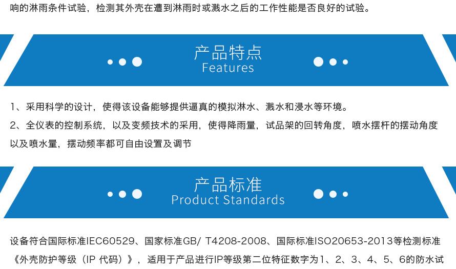 產(chǎn)品型號:IPX-1234 品牌:劍 喬 用途:可程式淋雨試驗箱適用于電工電子產(chǎn)品(包括組件)、燈具照明產(chǎn)品、汽車摩托車零部件外殼和密封件等產(chǎn)品做外殼防護等級測試(IP 防水等級試驗)